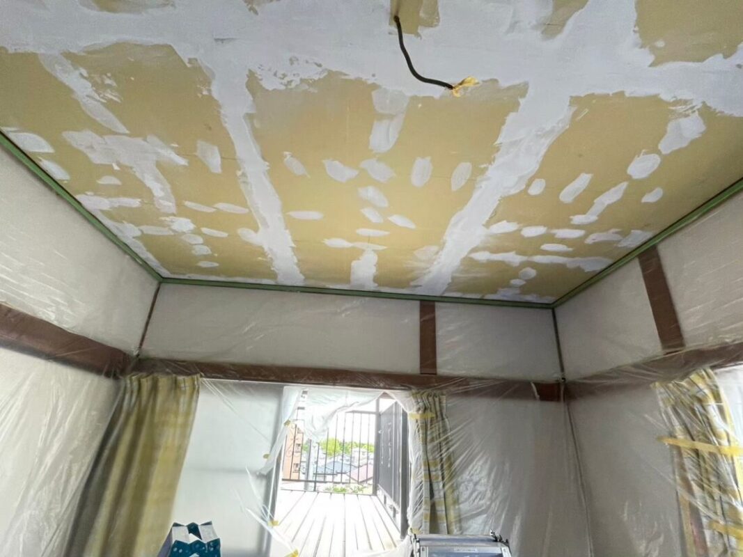 今回のリフォームは、古くなった天井を新しくするために、石膏ボードを貼ってから壁紙で仕上げました。石膏ボードは、安価で防火性や断熱性、遮音性にすぐれているため、天井や壁の下地材として広く利用させれています。