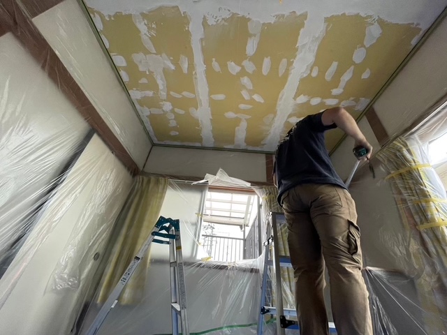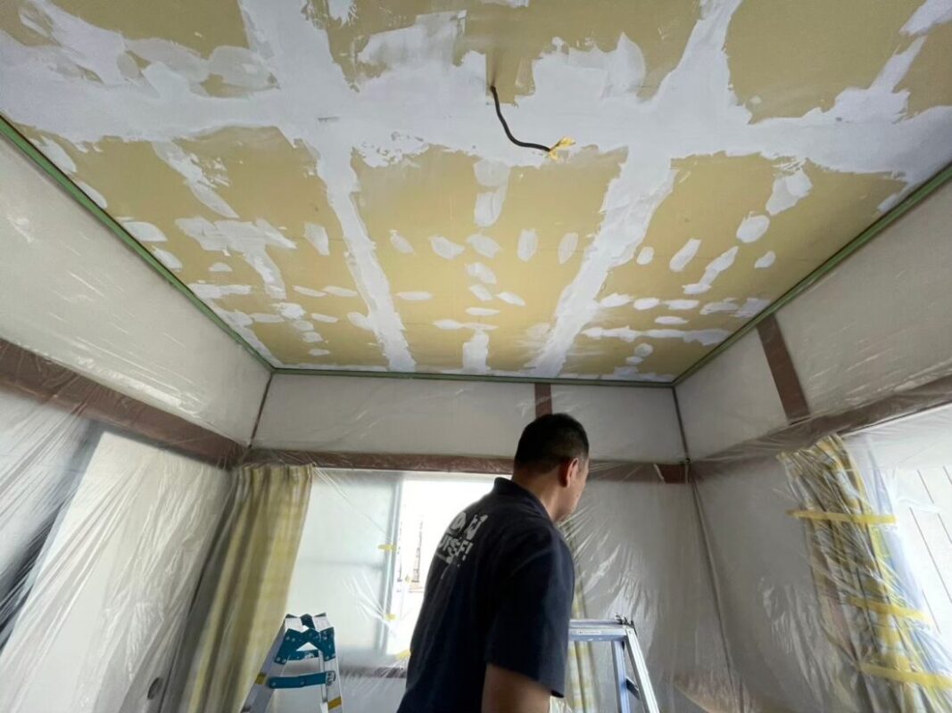 下地の状態を確認し、必要に応じて補強を行いました。その上に、防火性や遮音性に優れた石膏ボードを貼っていきます。石膏ボードは、カッターでカットできる施工しやすい建材ですが、天井への施工は重さもあり、専門的な技術が必要です。