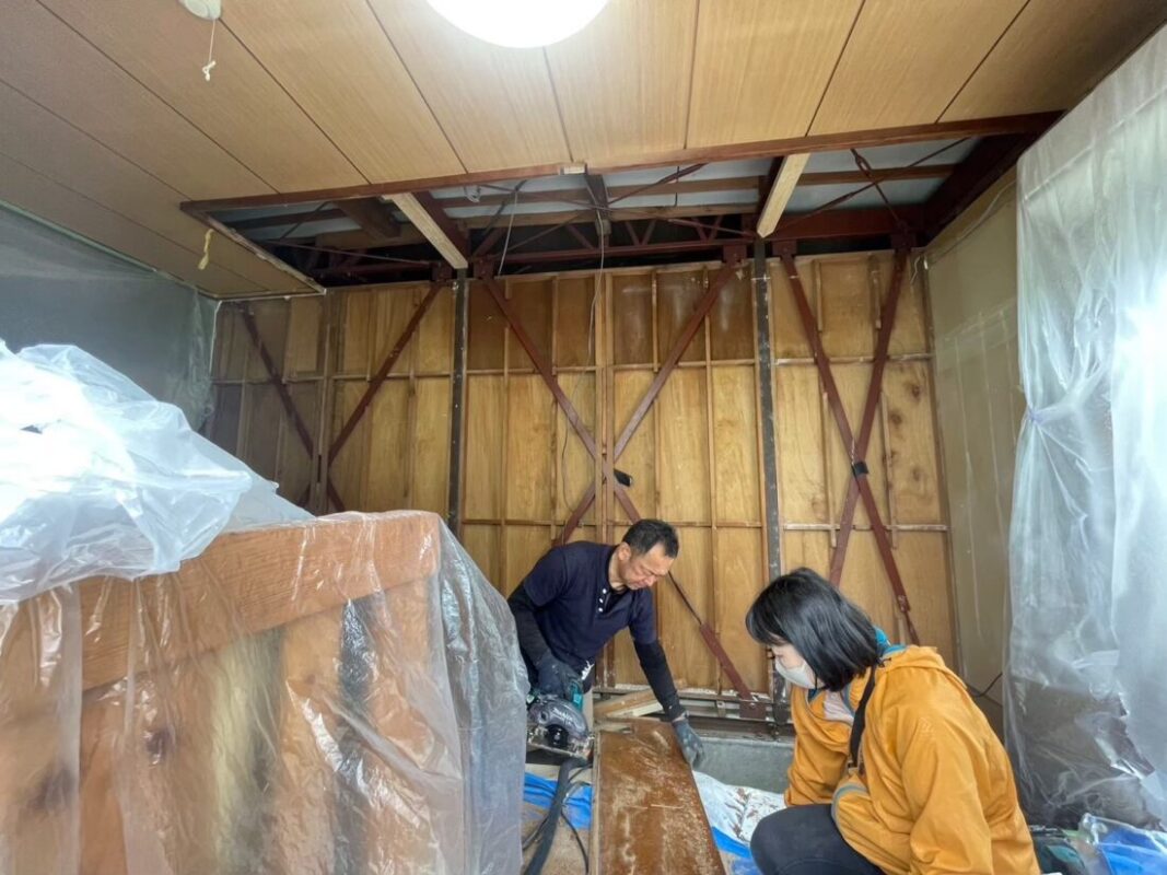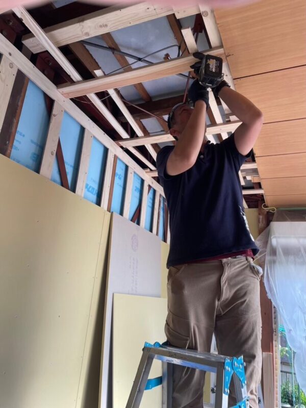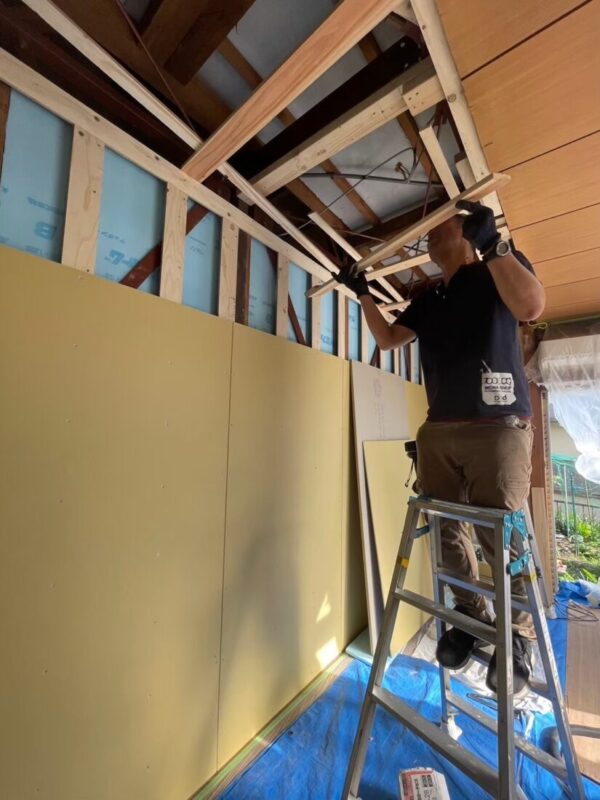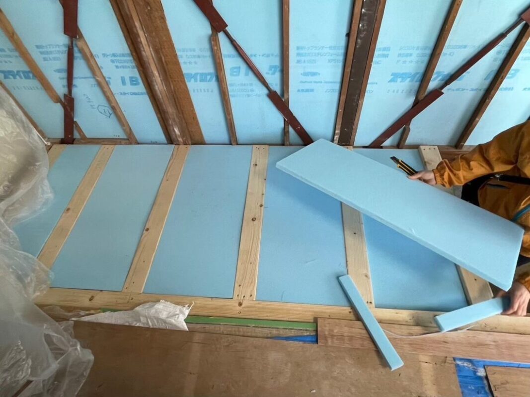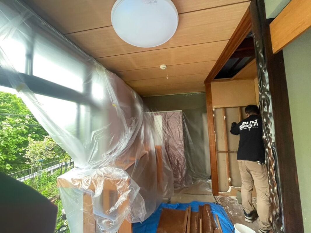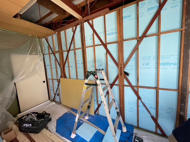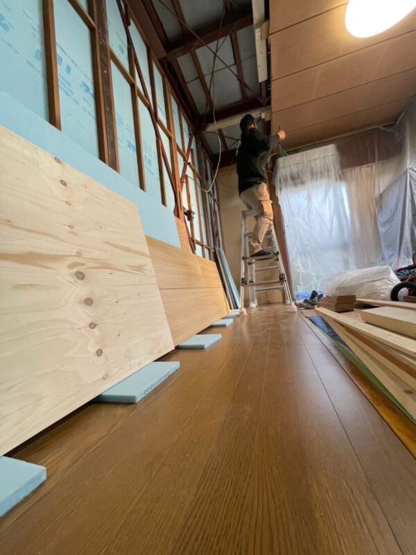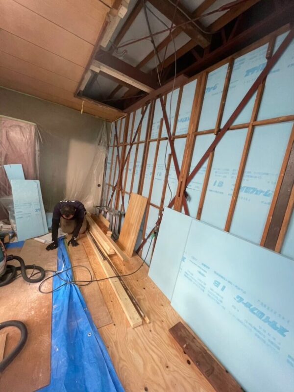解体後:天井、床の張替え、壁への断熱材施工作業中