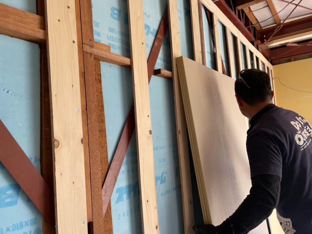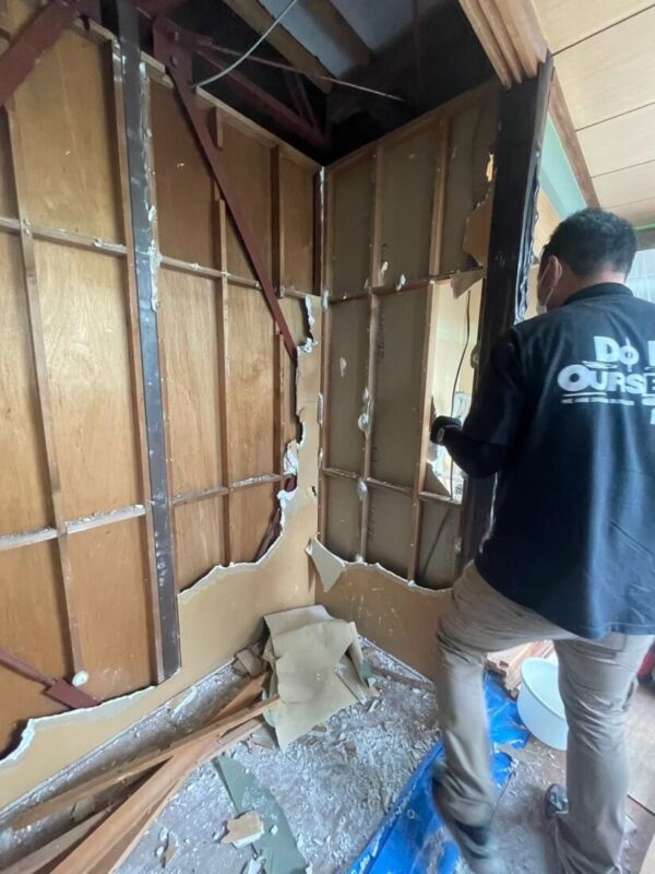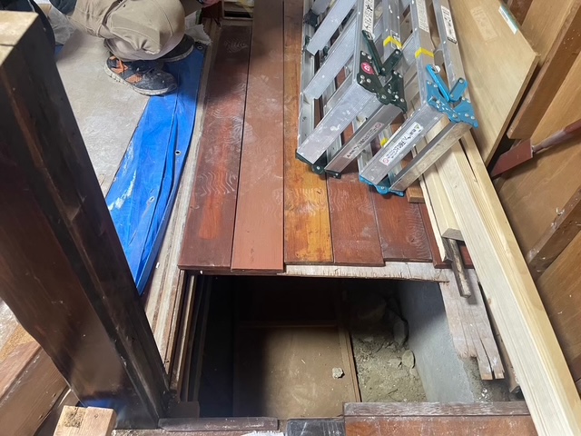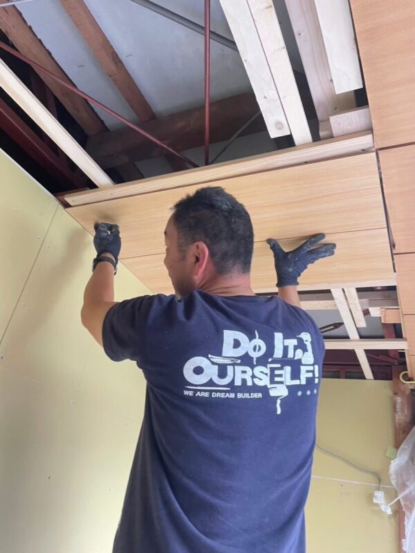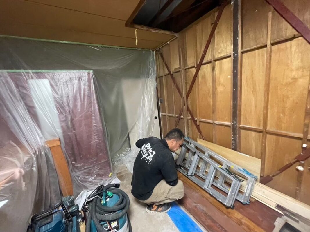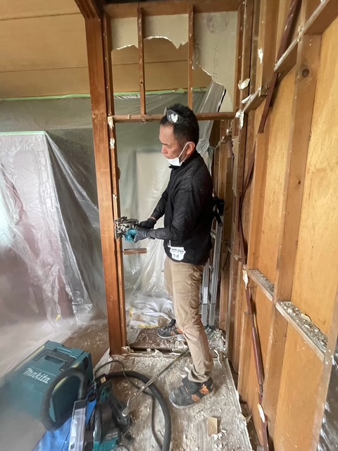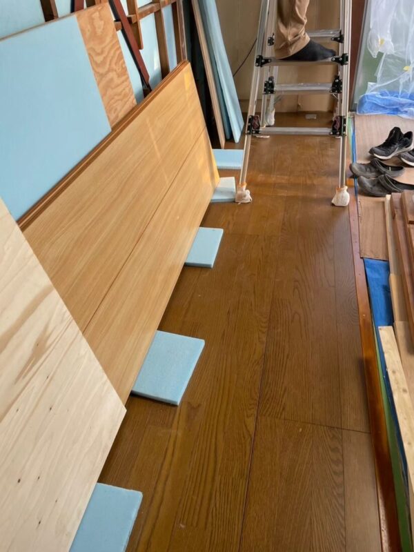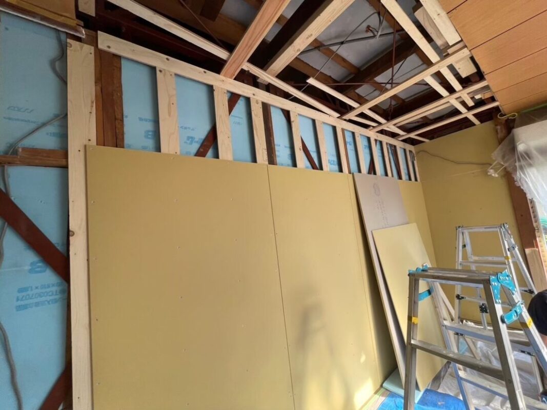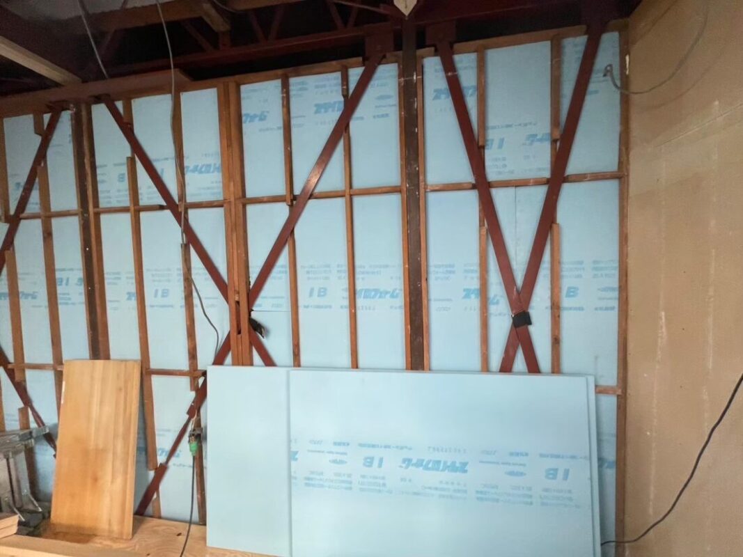 解体後:天井、床の張替え、壁への断熱材施工作業中