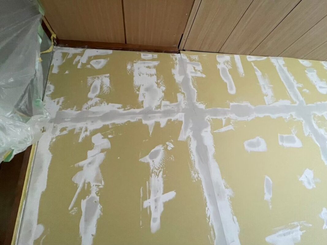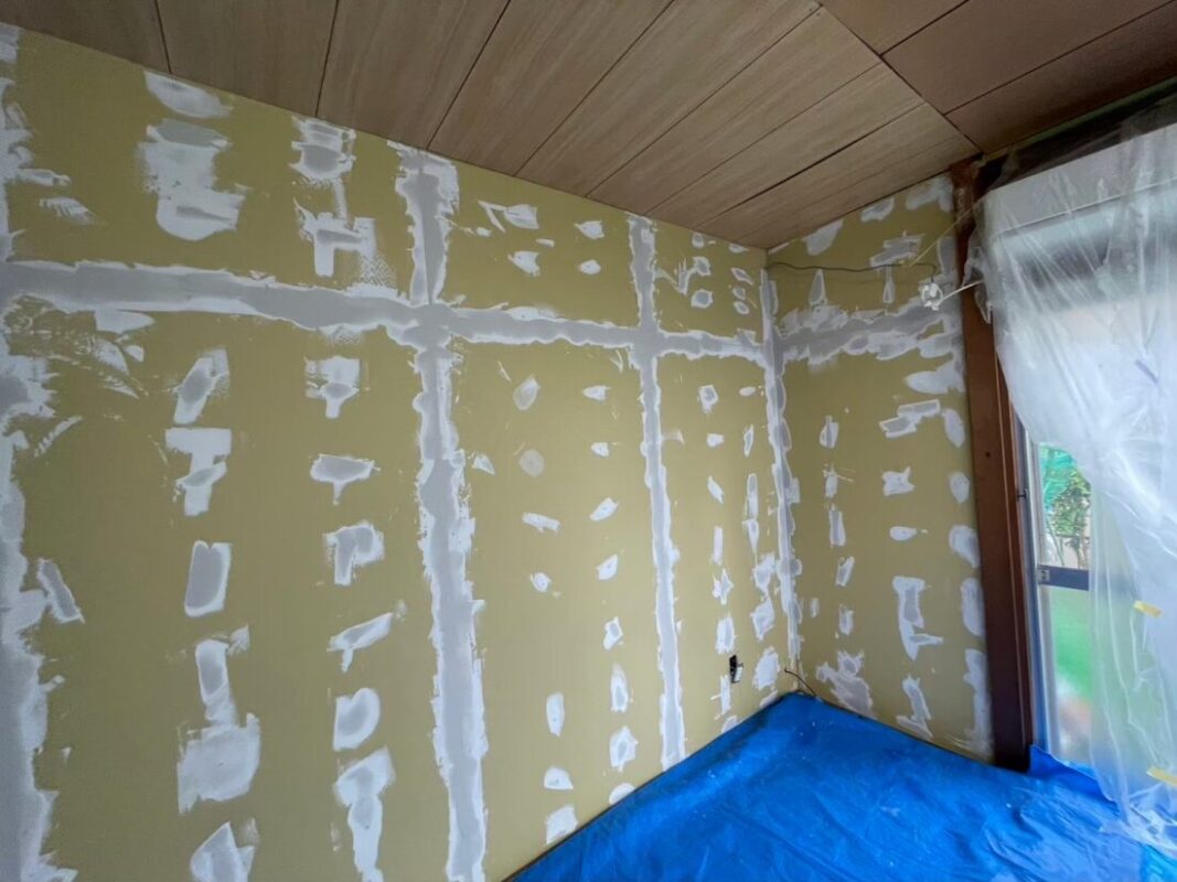 石膏ボードを貼り終えた後は、パテ処理を行っております。壁を平滑にするだけでなく、壁紙の粘着力を高め、ひび割れを防ぐ効果もあります。パテを塗布したの後は、しっかりと乾燥させ、ヤスリを使ってさらに平滑な面を作ります。まだ段差が気になる場合は、パテを塗ってヤスリがけを繰り返すことで、より均一な仕上がりになります!