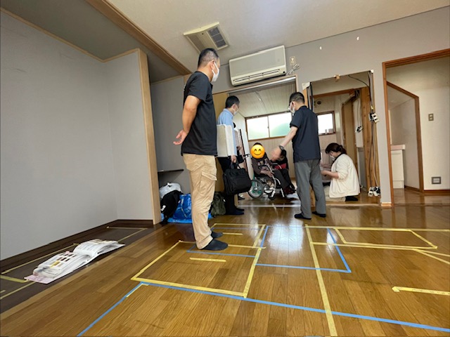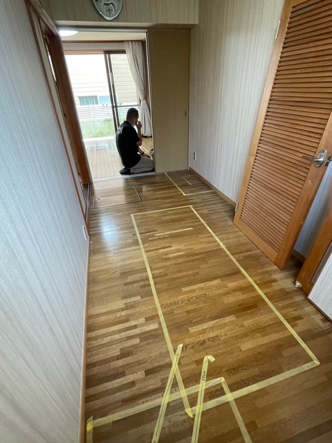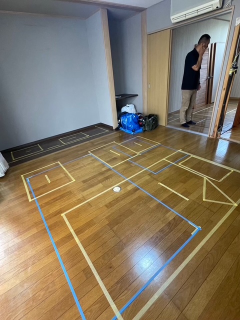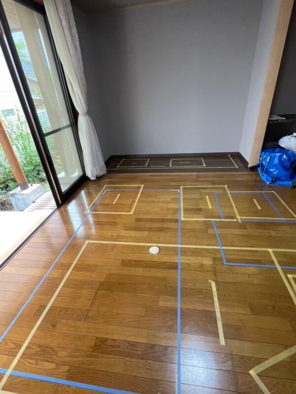 マスキングテープで実際に床に記すことで、写真や図面だけでは分かりにくい空間イメージを、より具体的に体験できます。