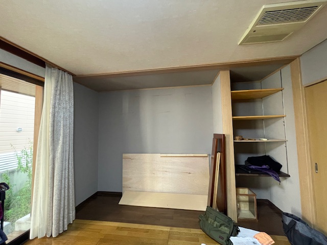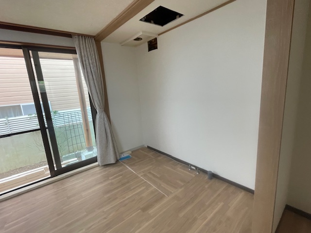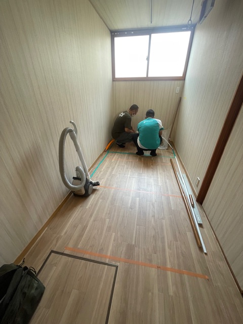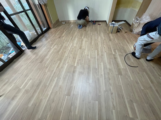 ⇊ クッションフロア施工中:転倒時に衝撃を和らげる床材を使用しております。